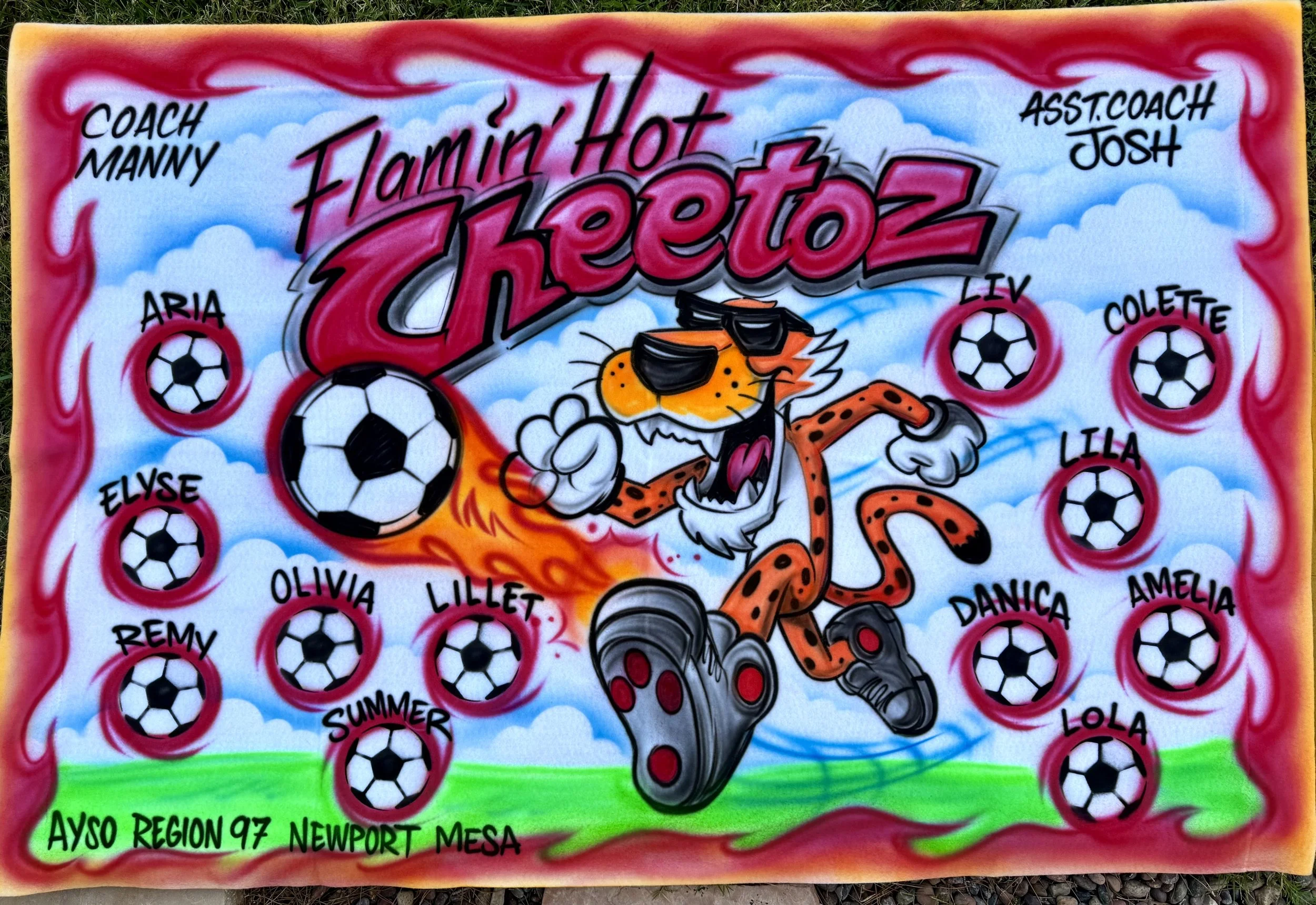We specialize in creating custom hand-painted airbrush team banners for sports teams, schools, and organizations nationwide. Each banner is professionally designed based on your team’s name, colors, mascot, and theme, delivering bold, high-quality artwork that makes a lasting impression. Our banners are carefully produced and shipped directly to your location, ready for team photos, events, and celebrations.